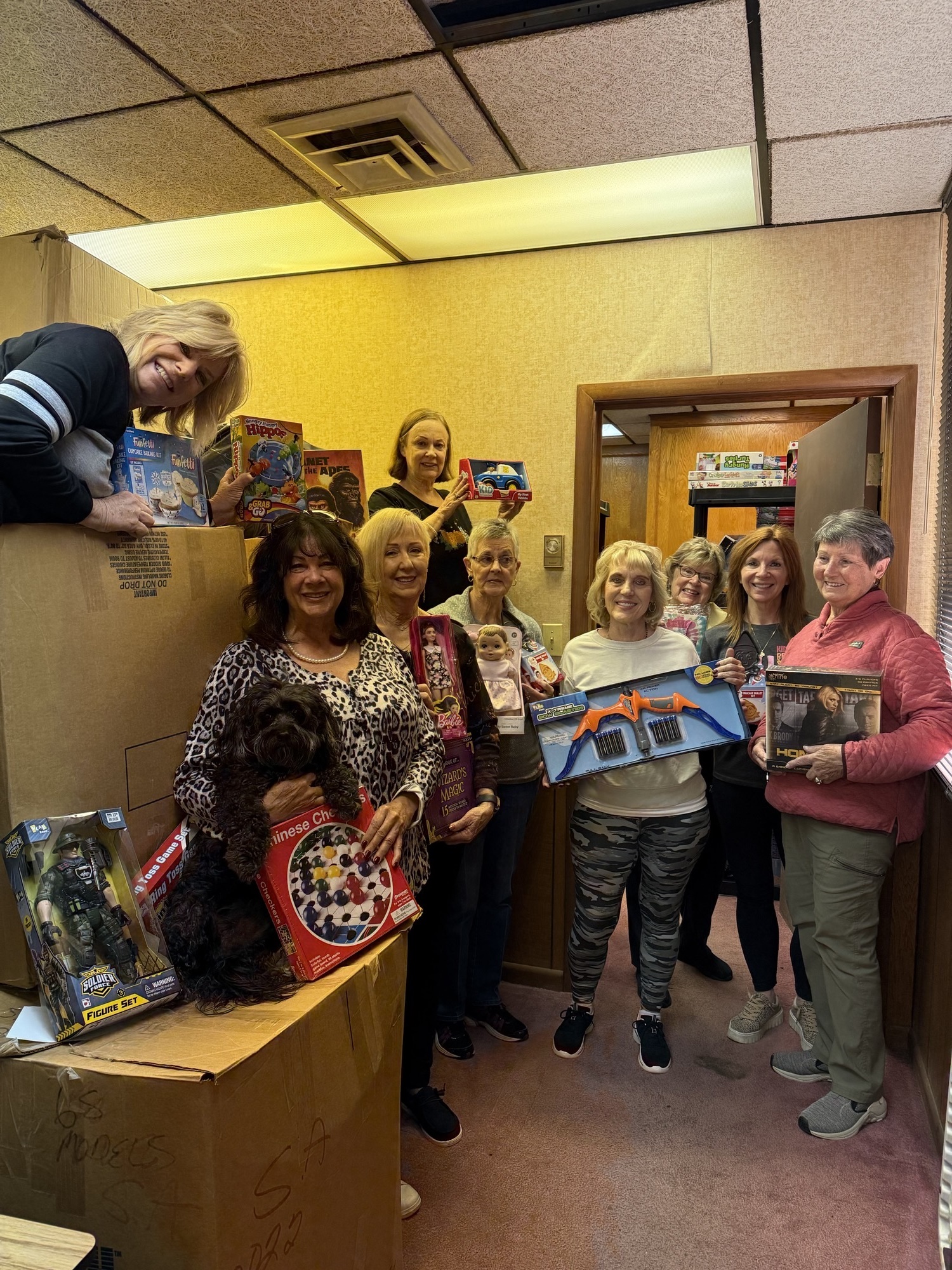 FOCLA Board Members unpack donated toys (left to right) – Peggy Cox, Annetta Bryant, Pam Davis, Marie Hambrick, Nancy Gentry, Darla Whitehair, Julia Long, Kristen Moore, Helga Gulley