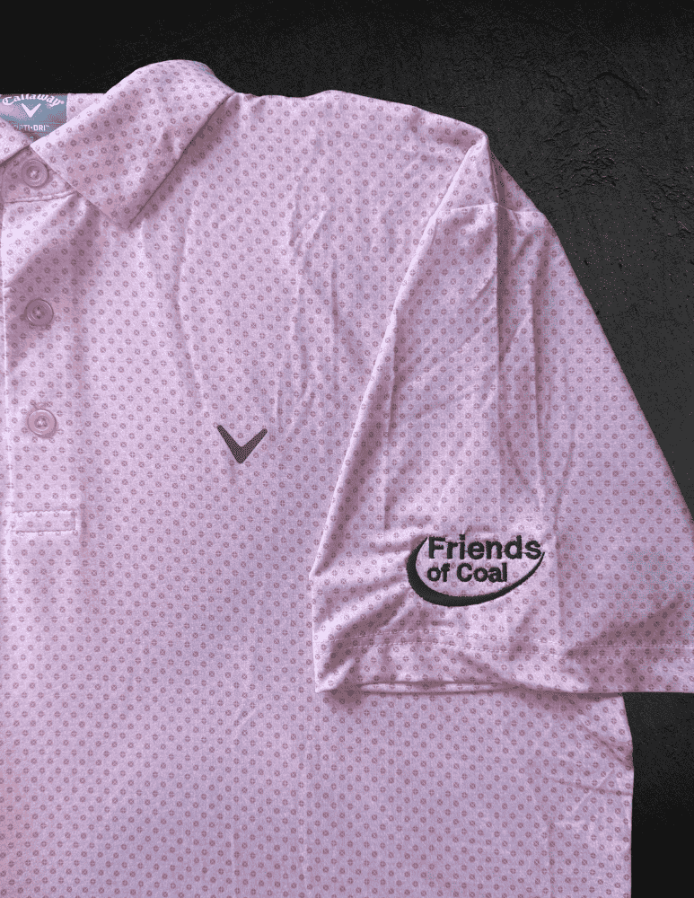 Callaway Anti UV, 4 Way Stretch, Moisture Wicking Men’s Performance Polo in Pink with Geometric Pattern with Friends of Coal logo on sleeve.