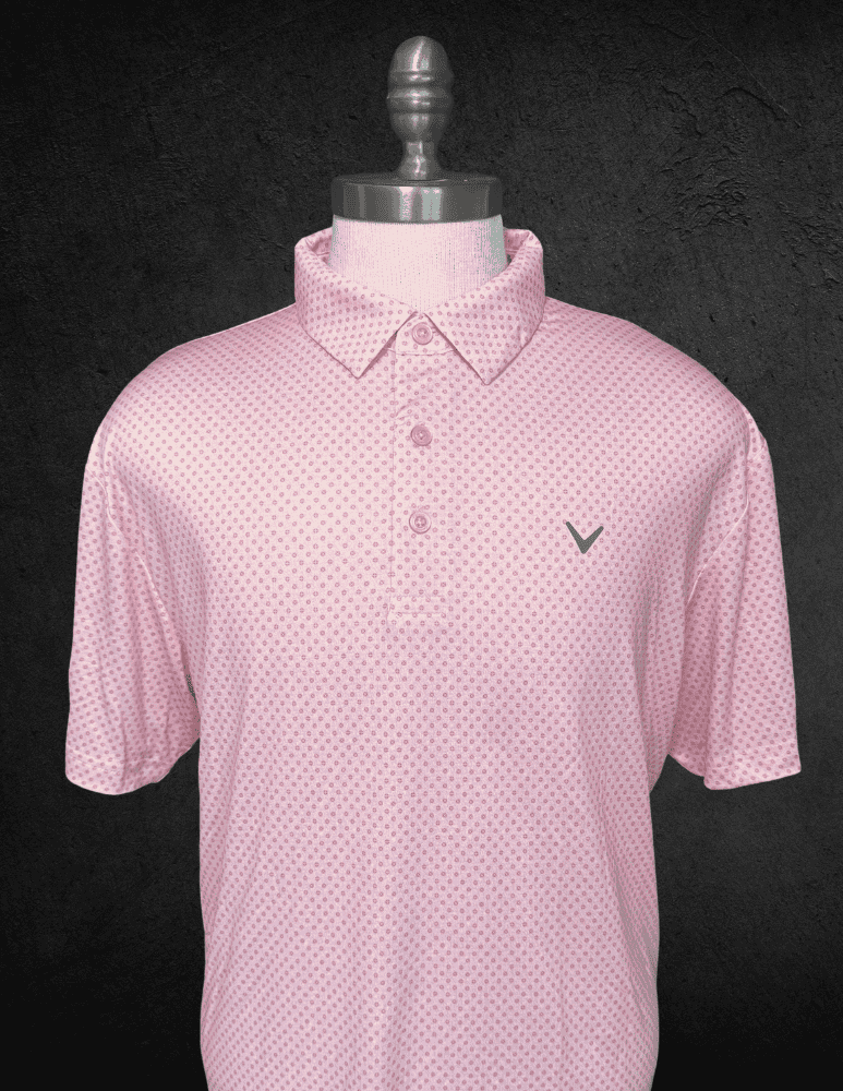 Callaway Anti UV, 4 Way Stretch, Moisture Wicking Men’s Performance Polo in Pink with Geometric Pattern with Friends of Coal logo on sleeve.