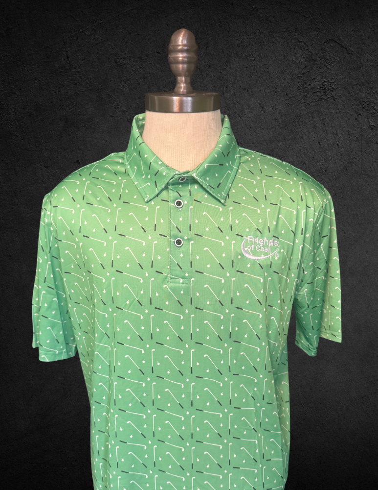 Anti UV, 4 Way Stretch, Moisture Wicking Men’s Performance Polo in Green with Golf Clubs