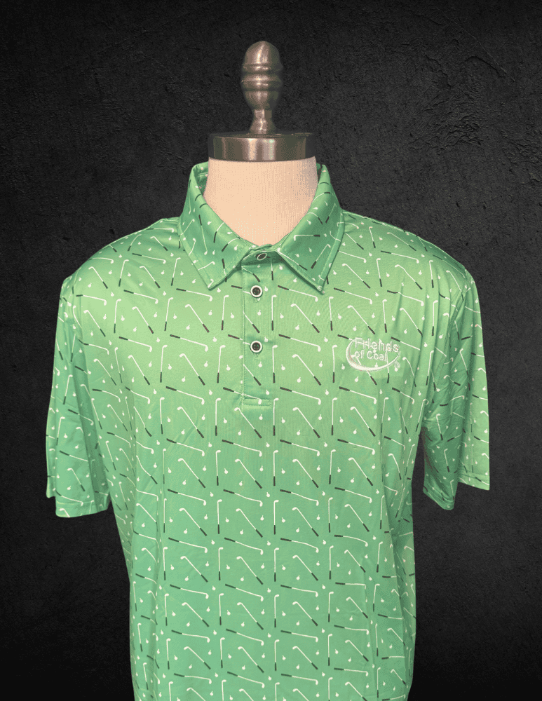 Anti UV, 4 Way Stretch, Moisture Wicking Men’s Performance Polo in Green with Golf Clubs.