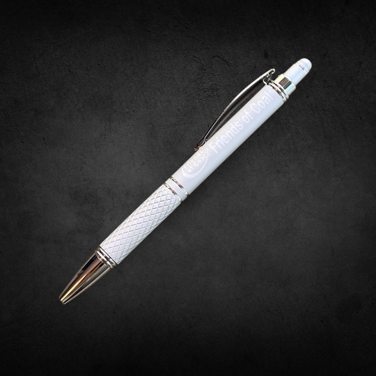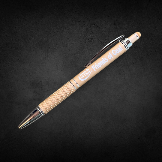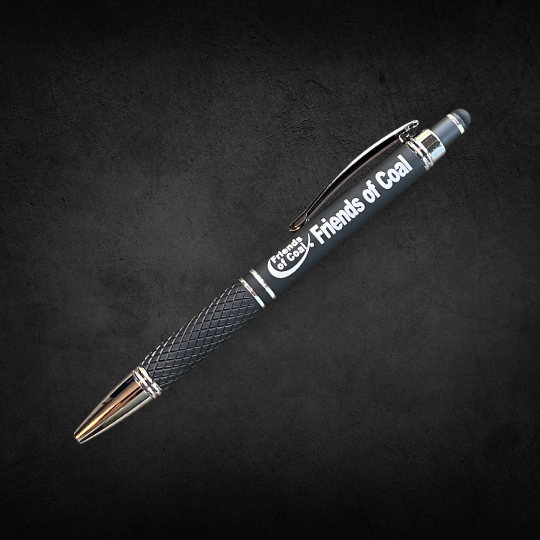 Custom Friends of Coal gunmetal ink pen with stylus clicker.