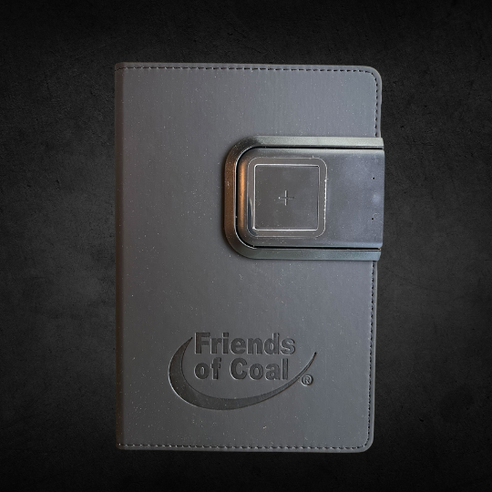 Compact and refillable writing journal with portable charging panel and Friends of Coal logo.