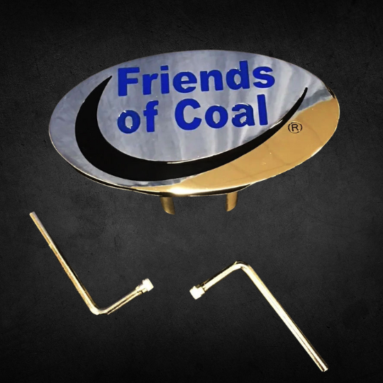 Chrome plated stainless steel Friends of Coal trailer hitch cover with pins. Fits most standard trailer hitches.